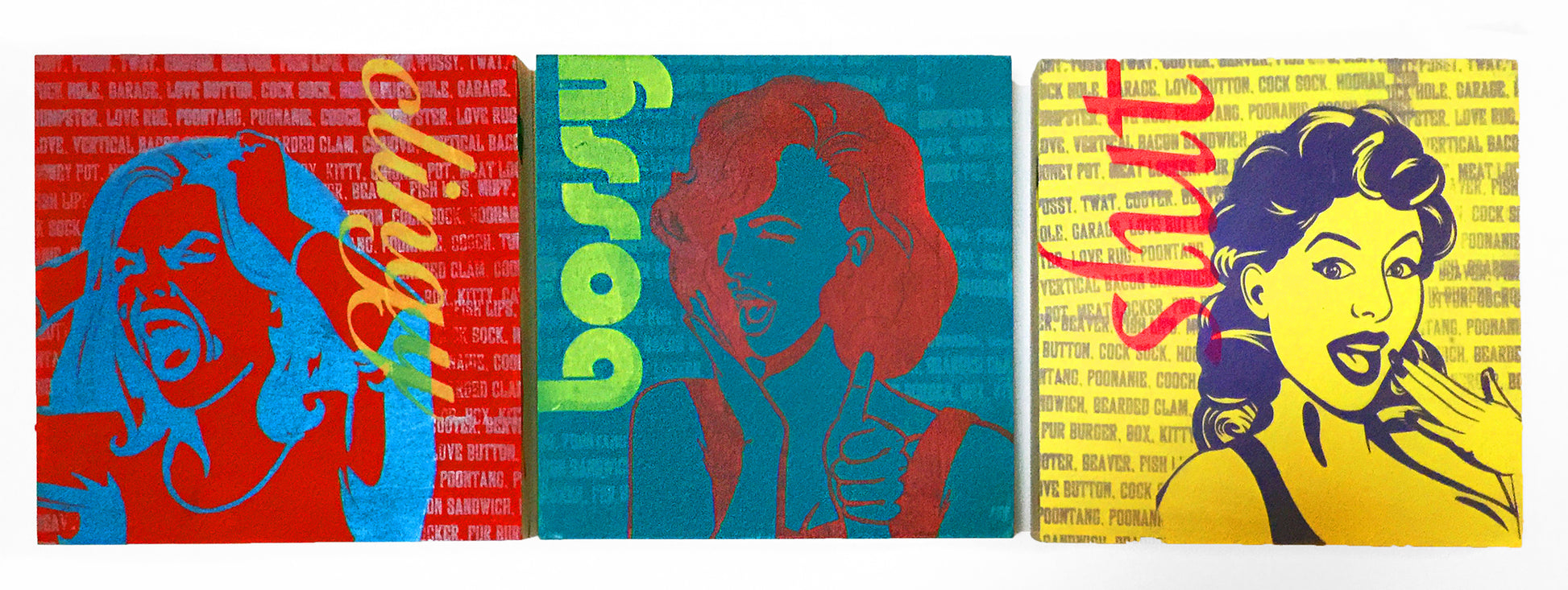 Acrylic, Spraypaint and Original Screenprint on Wood. 2021. 12"x12"x1.5" each. Ready to hang!