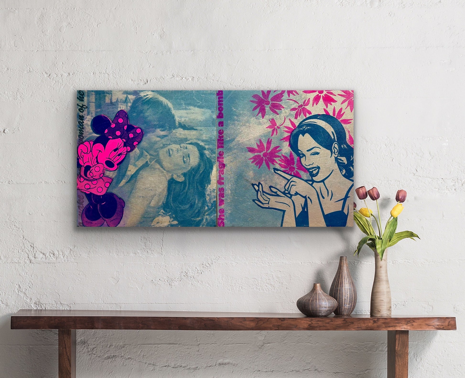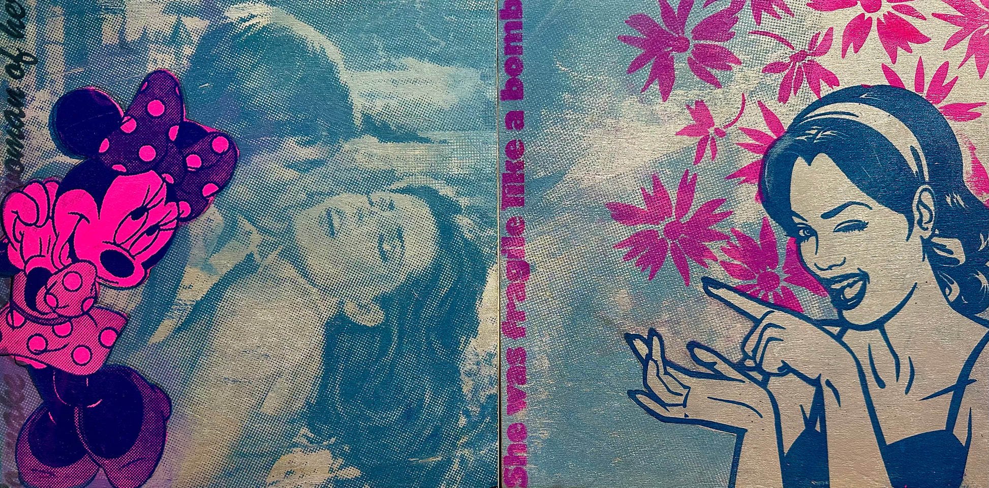 Acrylic, Spraypaint and Original Screenprint on Wood. 2023. 12"x24"x1.5". Ready to hang!