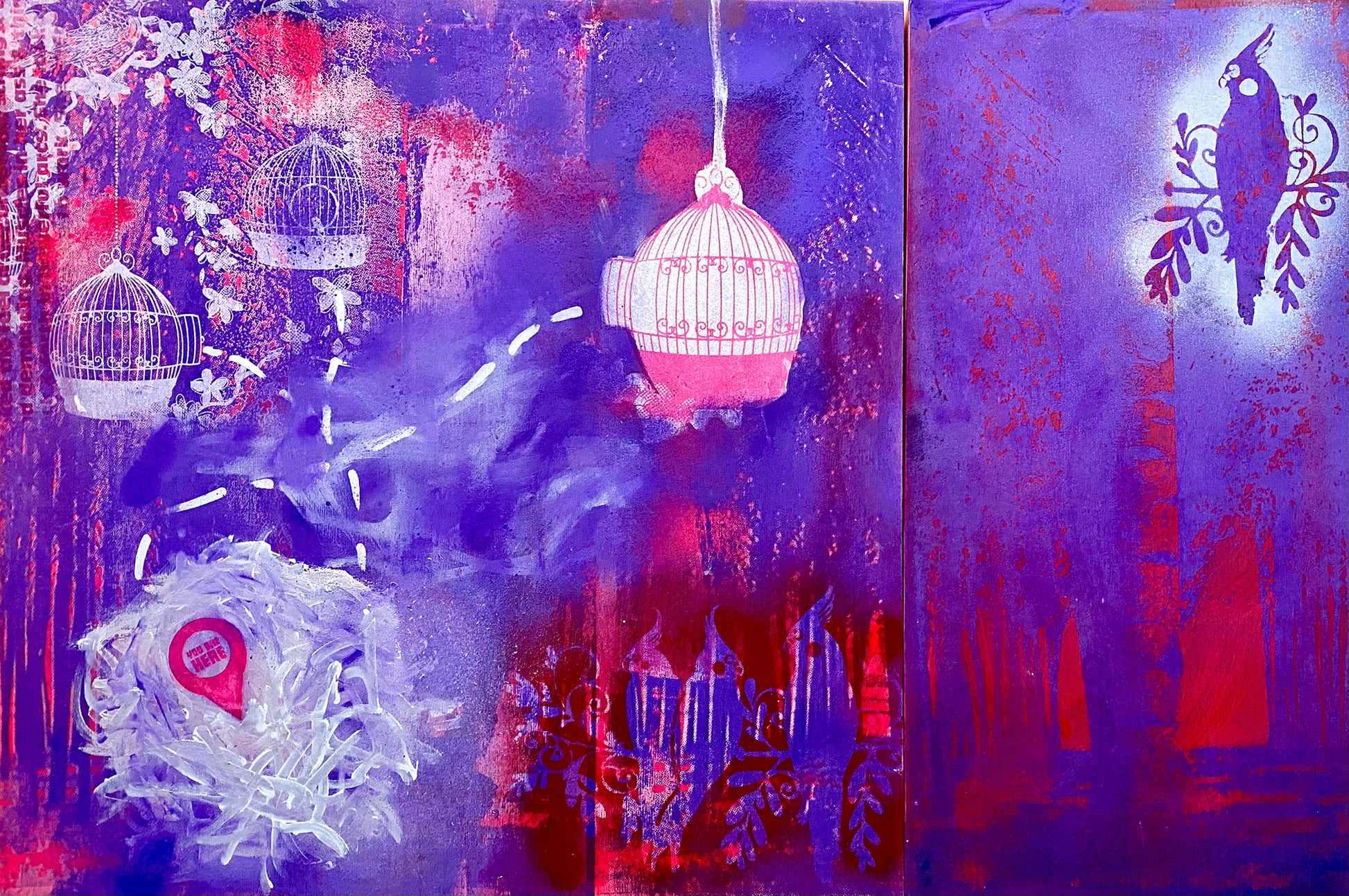 Acrylic, Spraypaint and Original Screenprint on Wood. 2021. 48"x36"x1.5". Ready to hang!