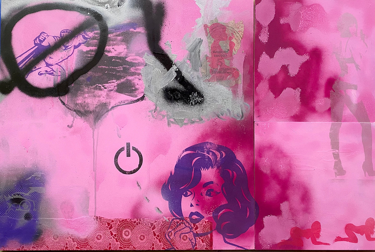 Acrylic, Spraypaint, Mixed Media and Original Screenprint on Wood. 2021. 36"x24"x1.5". Ready to hang!